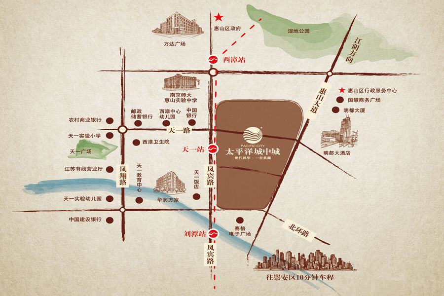 无锡太平洋城中城项目由无锡惠山太平洋商业房地产开发有限公司开发建设,项目投资总额为29000万美元。项目位于无锡市惠山区天一新城核心,惠山大道与天一路交汇处,周边有地铁天一站。项目总占地21万方,规划建筑面积117万方,物业性质为住宅及办公。项目分为三期建成:一期为8栋总高为18层的高层住宅和134户联排住宅组成,占地7.8万方,建筑面积18万方;二期是20余万方的商业配套,涵盖了太平洋百货、休闲、娱乐、台湾特色餐饮、体验式运动空间、酒店、办公楼;三期主要为32层高层、会所、文化艺术中心等。目前,一期项目在建,二三期暂未开工,售楼处已开放。